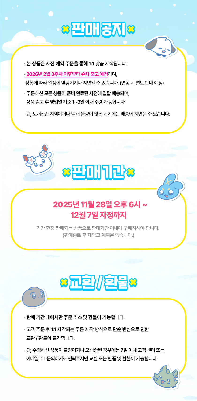All products delivered by MarppleShop are custom-made based on your order, so exchange/refund due to simple change of mind are not possible. However, if you receive a defective product or if there is a shipping error, you can contact our customer service within 7 days via email, Individual Inquiry, or through our customer center for exchange or refund.